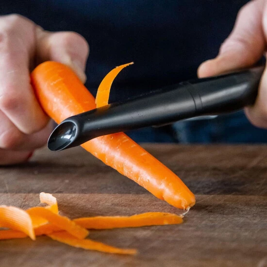 Kuchyňská škrabka je vybavena oboustranně vroubkovaným ostřím, které se zapichuje do zeleninových slupek i do ovoce s měkkou slupkou a dodává se s ochranným pouzdrem pro skladování.