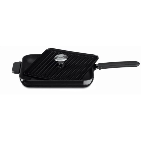 Grillpfanne 24cm x 24cm (der Boden der Pfanne selbst kommt mit dem Herd in Berührung 21cm x 21cm), Deckel 22cm x 22cm, Gesamtlänge der Pfanne inklusive Griff und Griff 45,5cm