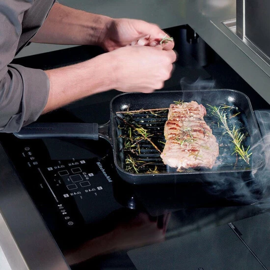 - Grillfunktion – Die Grillfunktion sorgt für konstante Temperaturen in der Grillpfanne. Sobald die Grillpfanne auf dem Kochfeld steht, wird sie automatisch vorgeheizt. Ein akustisches Signal informiert Sie, wenn die Pfanne bereit ist.