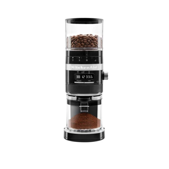 Wer seine Kaffeebohnen frisch vor dem Aufbrühen mahlt, weiß, dass das Aroma und der Geschmack frisch gemahlener Kaffeebohnen nicht zu übertreffen ist. Mit der Kaffeemühle von KitchenAid lässt sich für jeden gewünschten Mahlgrad das perfekte Mahlergebnis ganz nach gewählter Kaffeesorte und Brühmethode einstellen. Dabei ist es egal, ob Du groben Kaffee für Deine French Press oder feines Kaffeemehl für Deinen Espressokocher benötigst, denn bei 70 verschiedenen Mahlgraden ist Deiner mit Sicherheit dabei. Ganze Arbeit leisten dabei die Mahlwerke aus rostfreiem Stahl in Profiqualität, die für die optimale Aromaextraktion ein gleichmäßiges Kaffeemehl erzeugen. Das alles passiert ganz einfach auf Knopfdruck – einfach das passenden Symbol der Brühmethode und die gewünschte Dosierung wählen und schon sorgt die automatische Dosiertechnik für die ideale Menge und Konsistenz für die gewählte Brühmethode und Anzahl der Tassen. Besonders praktisch: die Kaffeemühle besitzt einen integrierten, verstellbaren Portafilterhalter, sodass direkt in 54-mm oder 58-mm Portafilter gemahlen werden kann und Du nur noch tampern musst. Die Kaffeemühle besitzt zwei Behälter – einen für die Bohnen, einen für das gemahlene Kaffeepulver – die beide UV-beständig sind und somit sowohl Bohnen als auch Kaffeepulver länger frisch halten.