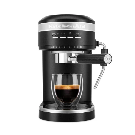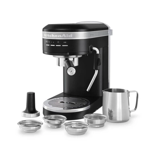 Die KitchenAid Familie hat ein neues Mitglied – die stilvolle Espressomaschine im klassischen KitchenAid Design versorgt nun alle Kaffee-Liebhaber und Liebhaberinnen mit ihrem Lieblingsgetränk, egal ob es sich um Espresso oder Getränke, die eine Espresso-Basis nutzen wie Latte, Cappuccino, Macchiato, Café Americano und Flat White. Die Espressomaschine mit dem robusten Metallgehäuse ist kompakt gestaltet, sodass sie auch in kleineren Ecken oder Nischen ihren Platz finden kann. Der Siebträger der Espressomaschine hat einen Durchmesser von 58 mm, wodurch die optimale Wärme gehalten werden kann. Dank der flachen Unterseite des Portafilers lässt sich wackelfrei gleichmäßig und homogen tampern. Dabei hat man vorab die Wahl zwischen doppel- oder einwandigen Siebeinsätzen. Die Espressomaschine von KitchenAid besitzt zwei intelligente Temperatursensoren, die während des Brühvorgangs miteinander kommunizieren und so für die perfekte Temperatur und authentischen Geschmack sorgen. Aber was ist ein Espresso ohne die perfekte Crema? Nicht viel! Gut, dass die Niederdruck-Vorinfusion und der Druck von 15 bar der italienischen Pumpe für eine reichhaltige und dichte Crema sorgen. Aber natürlich wurde auch an die Freunde und Freundinnen von Milchschaum gedacht. Die Dampfdüse erzeugt ausreichend Dampf, um Milch oder Haferdrinks zu perfekten cremigen Schaum aufzuschäumen. Alternativ lässt sich auch Milch aufheizen oder heißes Wasser zapfen.