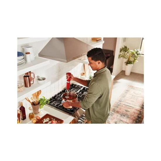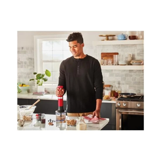 Flexibilní a snadno ovladatelný bezdrátový tyčový mixer KitchenAid v královsky červené barvě se rychle stane jedním z vašich oblíbených zařízení. Mixovací nádoba o objemu 700 ml bez obsahu BPA s odměrkou a víkem snižuje potřebu používat několik odměrek nebo mís. Jednoduše můžete připravit, naservírovat a uskladnit potraviny v jediné nádobě. Bez ohledu na to, zda připravujete polévku nebo šleháte mléčný koktejl, vše snadno uděláte pomocí dostatečně dlouhé odnímatelné mixovací tyče z nerezové oceli.