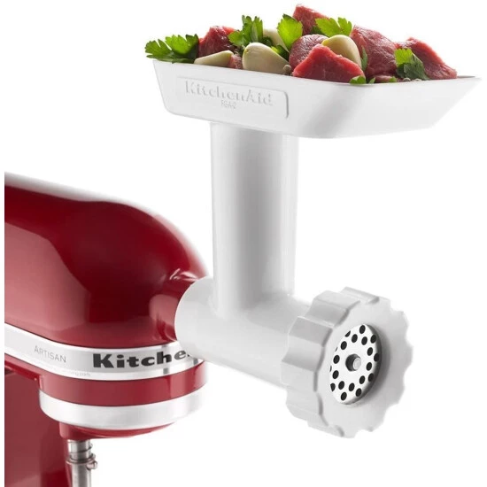 KitchenAid Zubehör Artisan Fleischwolf FGA Der KitchenAid Zubehör Artisan Fleischwolf ist ein praktisches Zubehör für alle KitchenAid Küchenmaschinen und macht das Zerkleinern und Zermahlen von Fisch und Fleisch, Gemüse, trockenem Brot und Käse zu einem Kinderspiel. Er hilft bei der Zubereitung von Hackbraten, Brotaufstrichen, Paniermehl und Pasteten. Technische Daten Passend für alle KitchenAid Küchenmaschinen Gehäuse und Haltering: Kunststoff Spülmaschinengeeignet Lieferumfang: 1 x Artisan Fleischwolf FGA, 1 x selbstschärfendes Edelstahlmesser, 1 x grobe Edelstahllochscheibe, 1 x feine Edelstahllochscheibe, 1 x Stopfer, 1 x Schraubenschlüssel